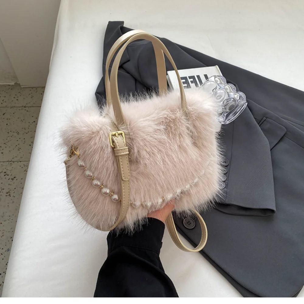 Fairy Handbag Pearl Chain Plush Small Square Bag For Women Fashion Elegant Shoulder Crossbody Bag Autumn Winter Versatile Totes